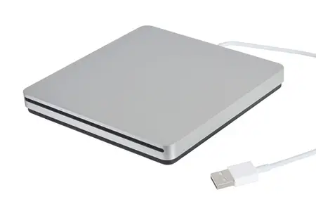 Leitor gravador externo de CD/DVD cinza com cabo USB branco