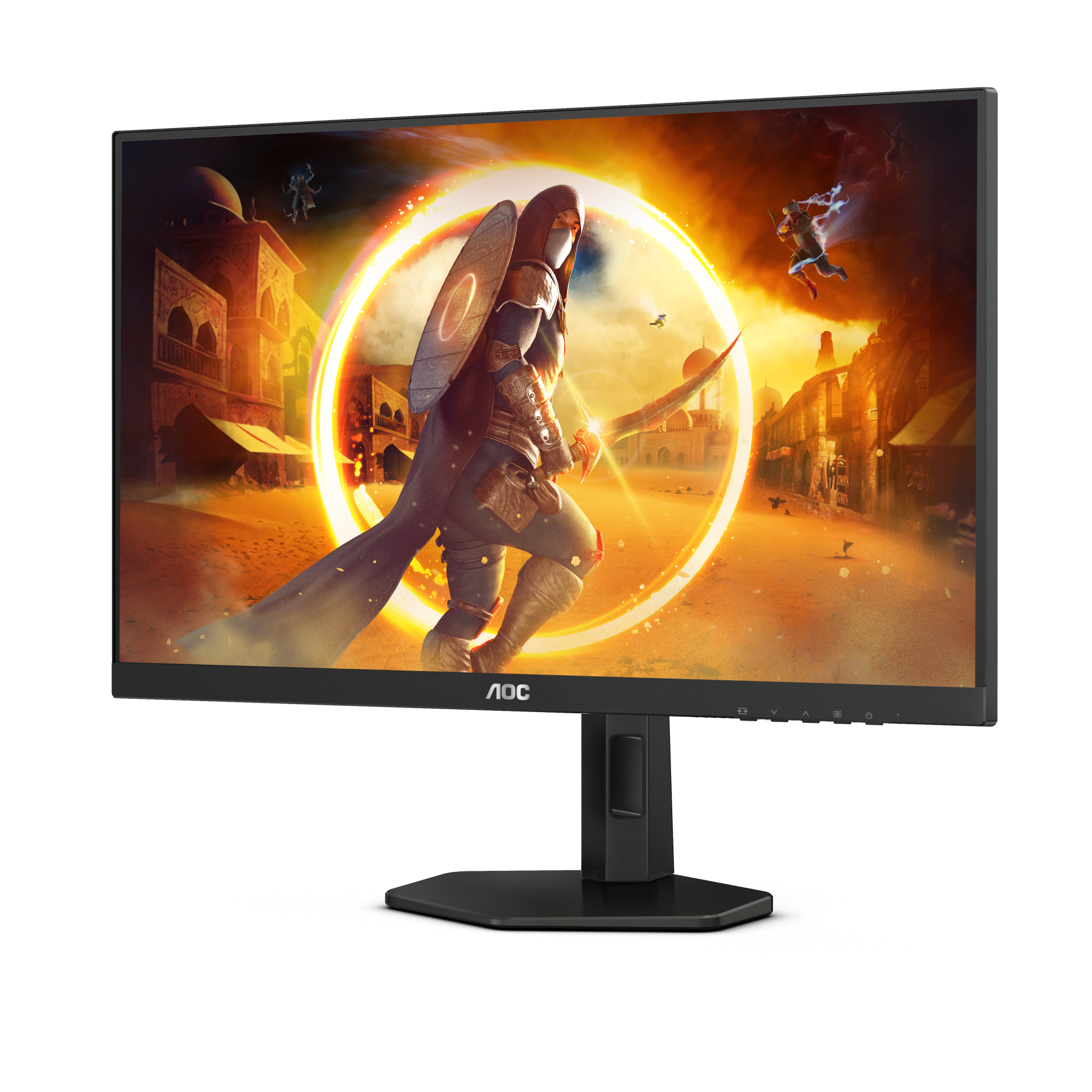Monitor AOC preto com imagem de jogo de guerreiro e fogo no ecrã