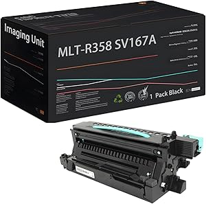Unidade de impressão MLT-R358 SV167A com caixa preta e unidade de impressão preta com detalhes azul claro no fundo branco.