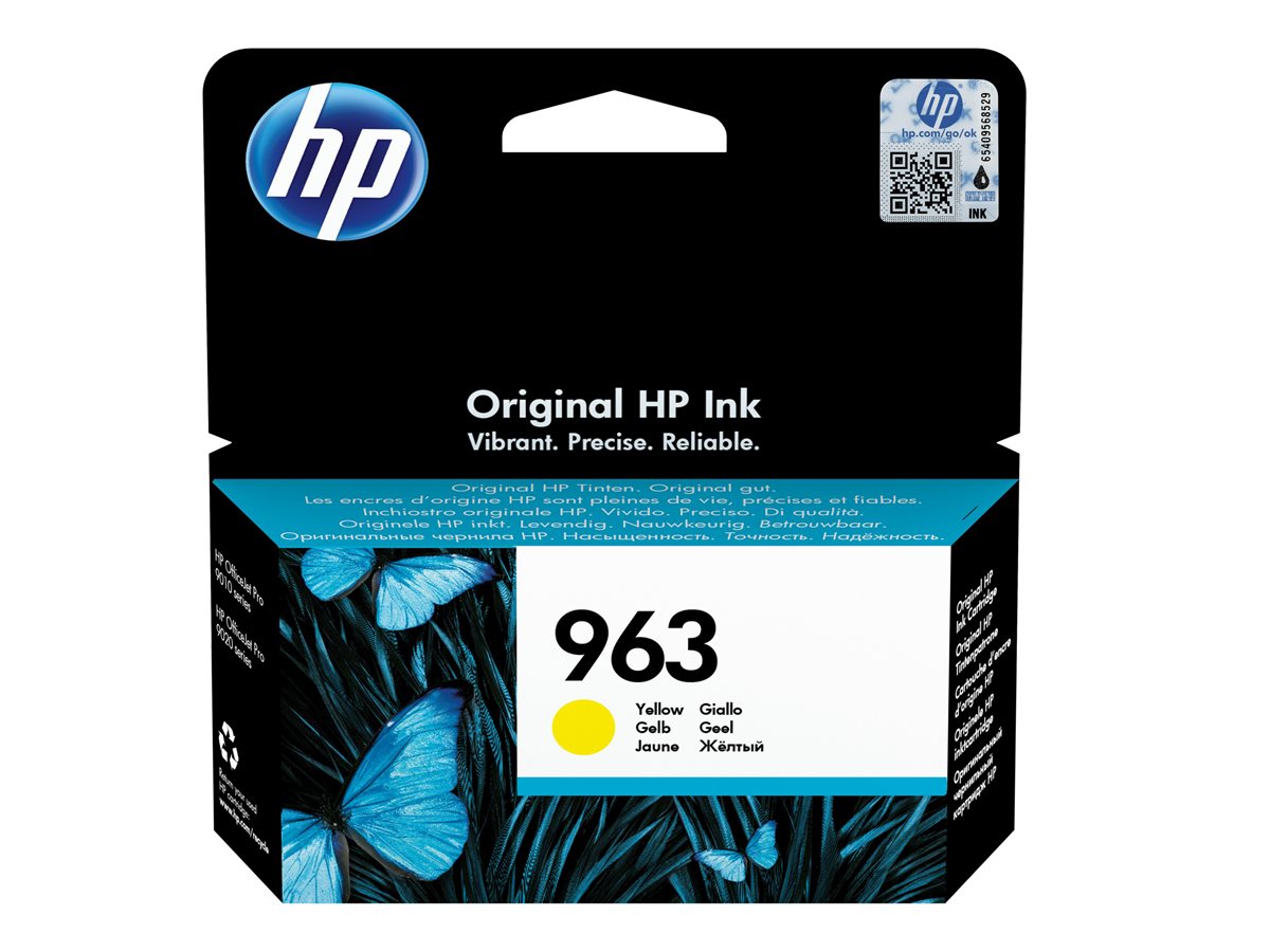 Cartucho de tinta HP 963 amarelo em embalagem preta e azul com borboletas