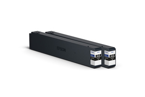 Cartucho de tinta Epson preto com rótulos brancos sobre fundo branco
