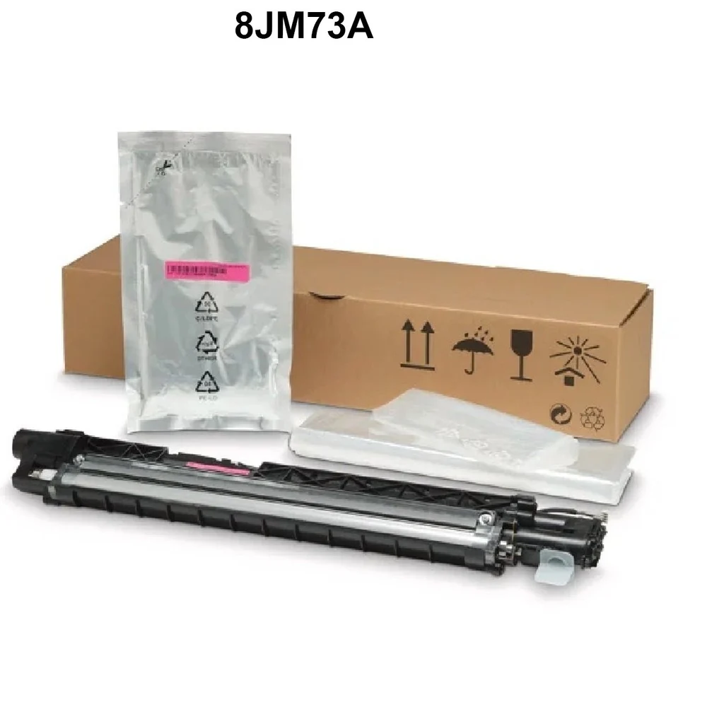 Kit de peças de impressora com rolo preto, sacos plásticos e caixa castanha com ícones de cuidado