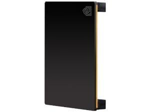 Placa retangular preta com bordas douradas e presilhas pretas.