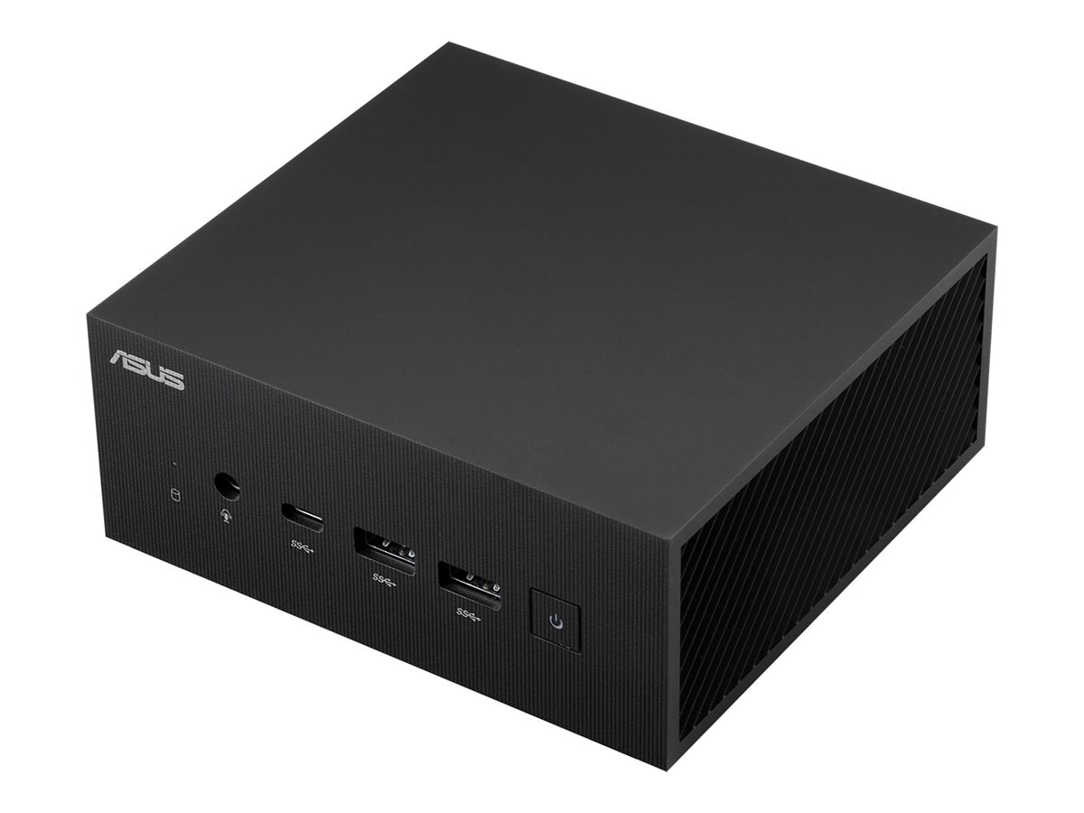 Mini PC ASUS preto com portas frontais e textura riscada nas laterais