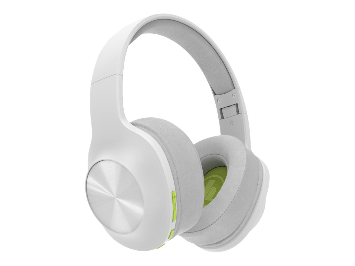 Headphones over-ear brancos com almofadas cinza claro e detalhes verdes.