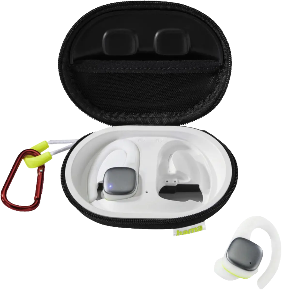 Estojo preto com cargador branco e auscultadores brancos com mosquetão vermelho.