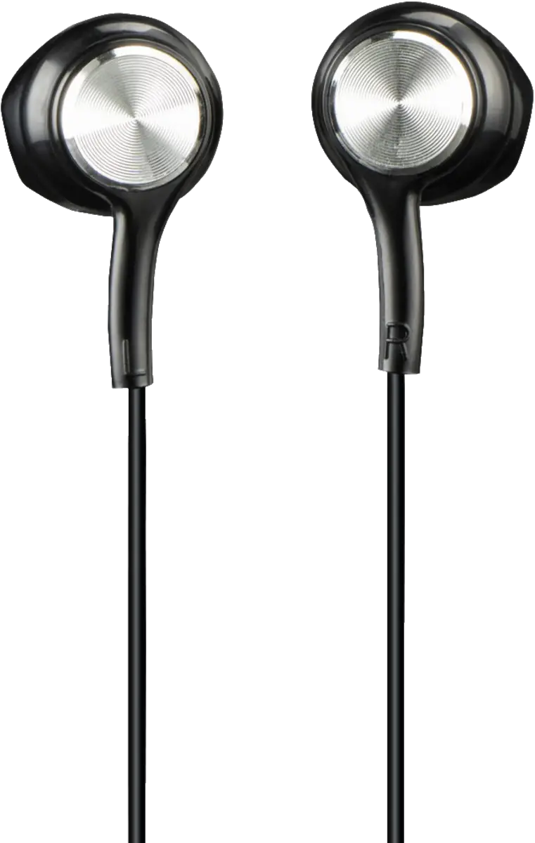 Auriculares intra-auriculares pretos com detalhes metálicos prateados.
