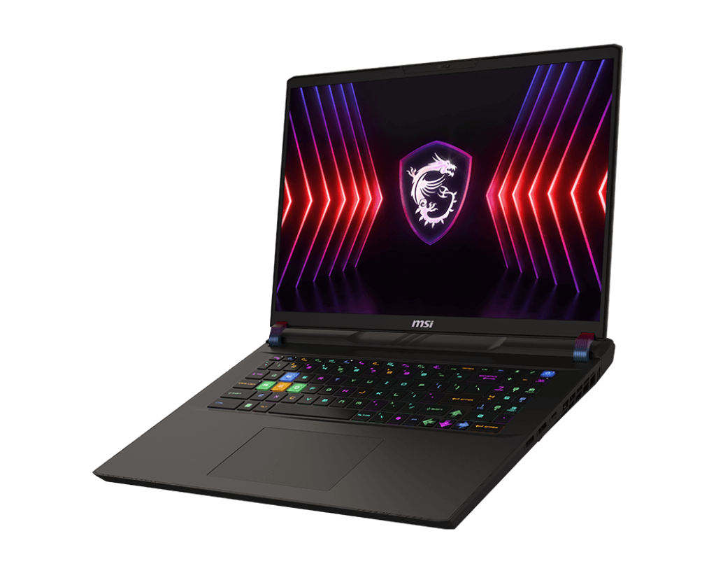 Computador portátil MSI aberto com teclado colorido e logótipo de dragão no ecrã