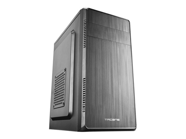 Torre de computador preta com painel frontal metálico escovado e marca TACENS.