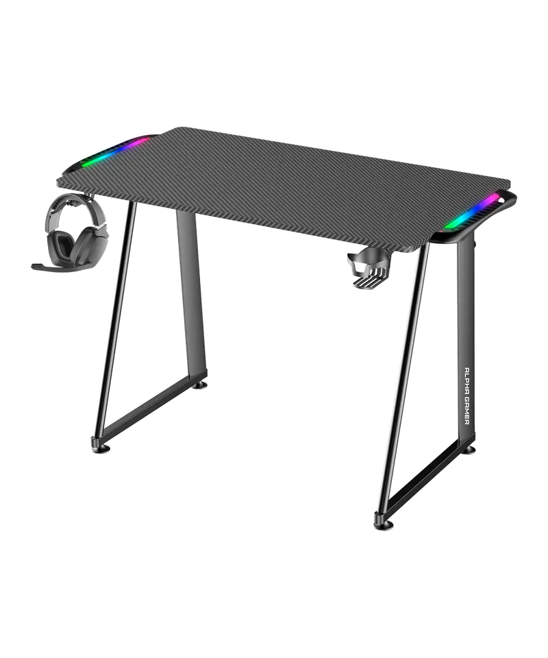 Secretária preta com iluminação RGB e auscultadores pendurados