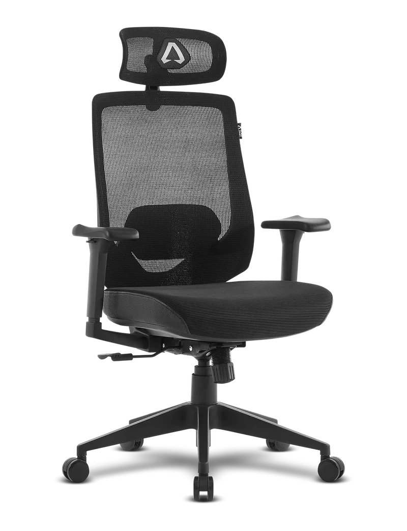 Cadeira de escritório preta com encosto de malha e apoio de cabeça