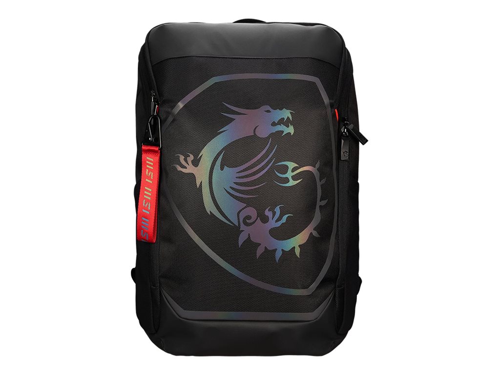 Mochila preta com símbolo holográfico de dragão e alça vermelha MSI