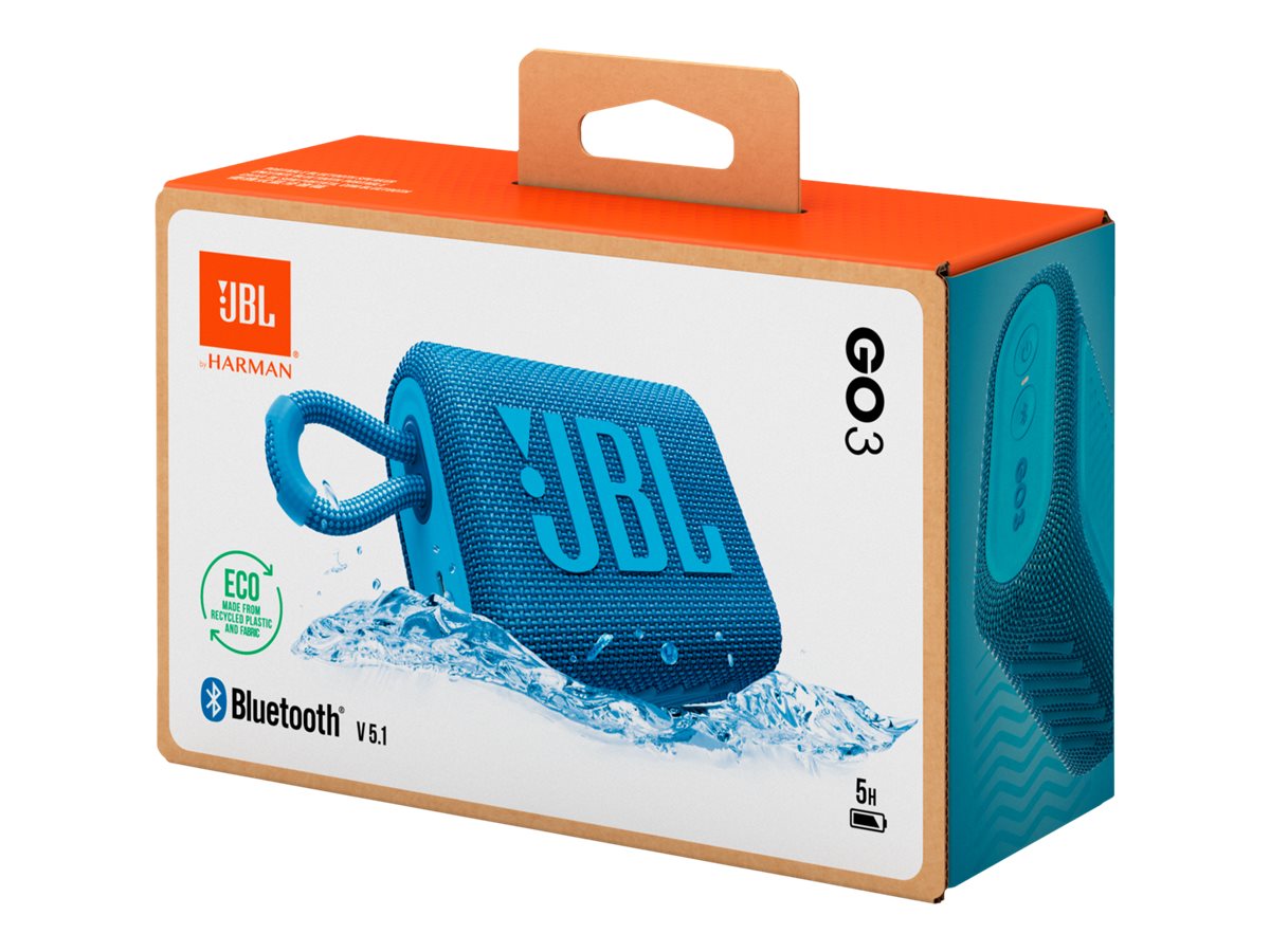 Embalagem da coluna portátil JBL GO 3 azul com carabina e selo ECO RECYCLABLE
