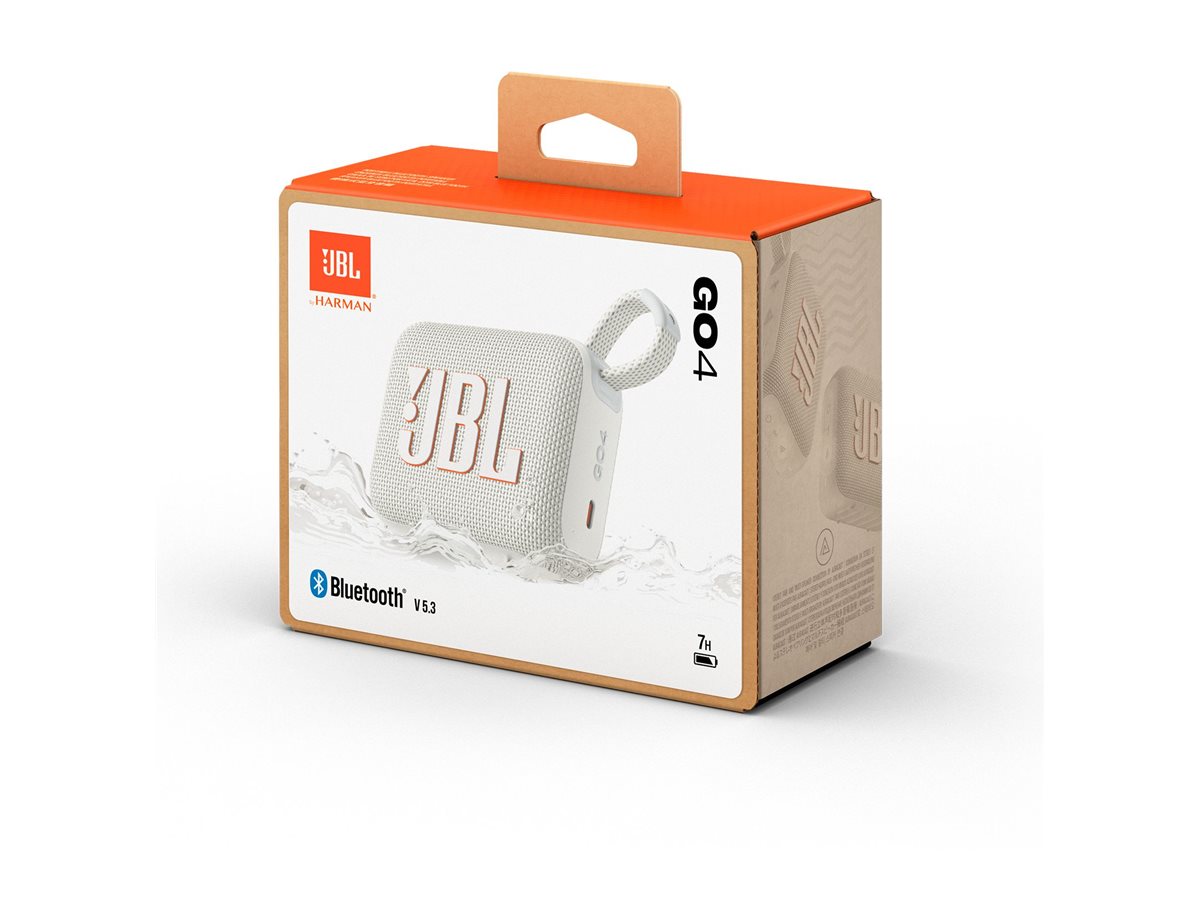 Caixa de som portátil JBL GO 4 branca na embalagem.