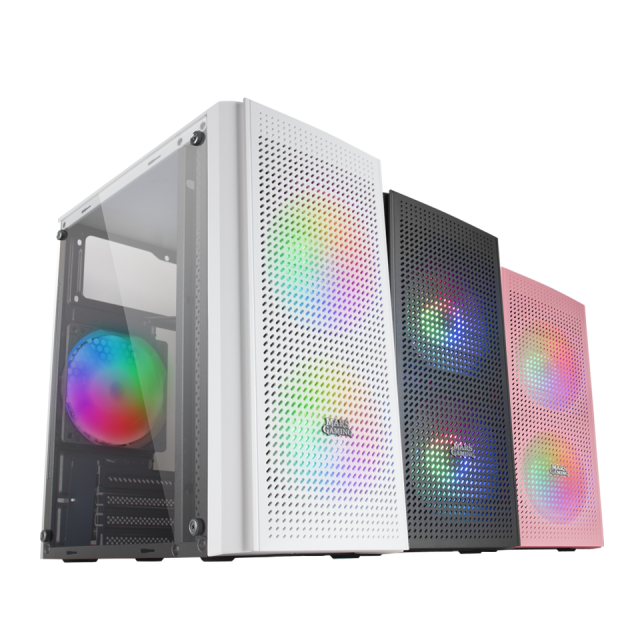 Três caixas de PC gamer com ventiladores RGB e painéis frontais perfurados nas cores branca, preta e rosa.