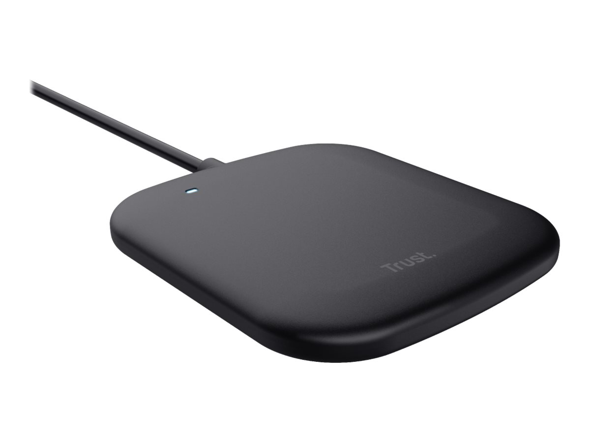 Carregador sem fios preto da marca Trust com indicador luminoso azul.