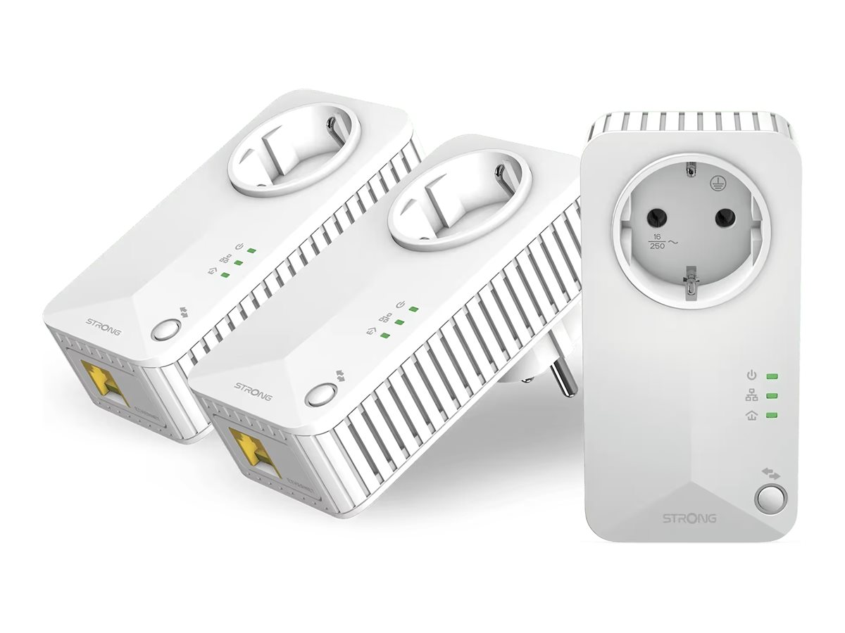 Adaptadores de tomada brancos com indicadores LED e conexão Ethernet amarela
