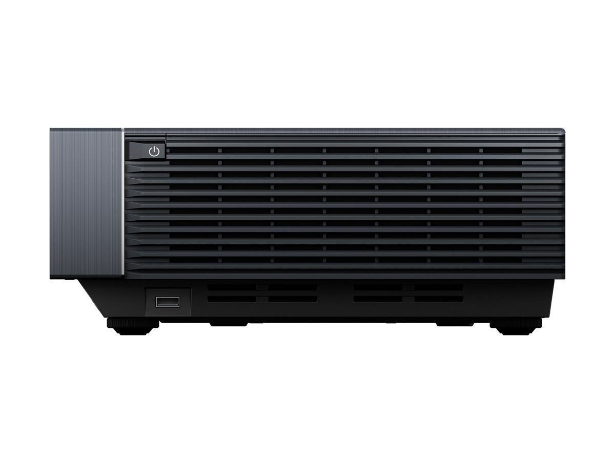 Projetor de vídeo preto retangular com grelha frontal e botão de ligar