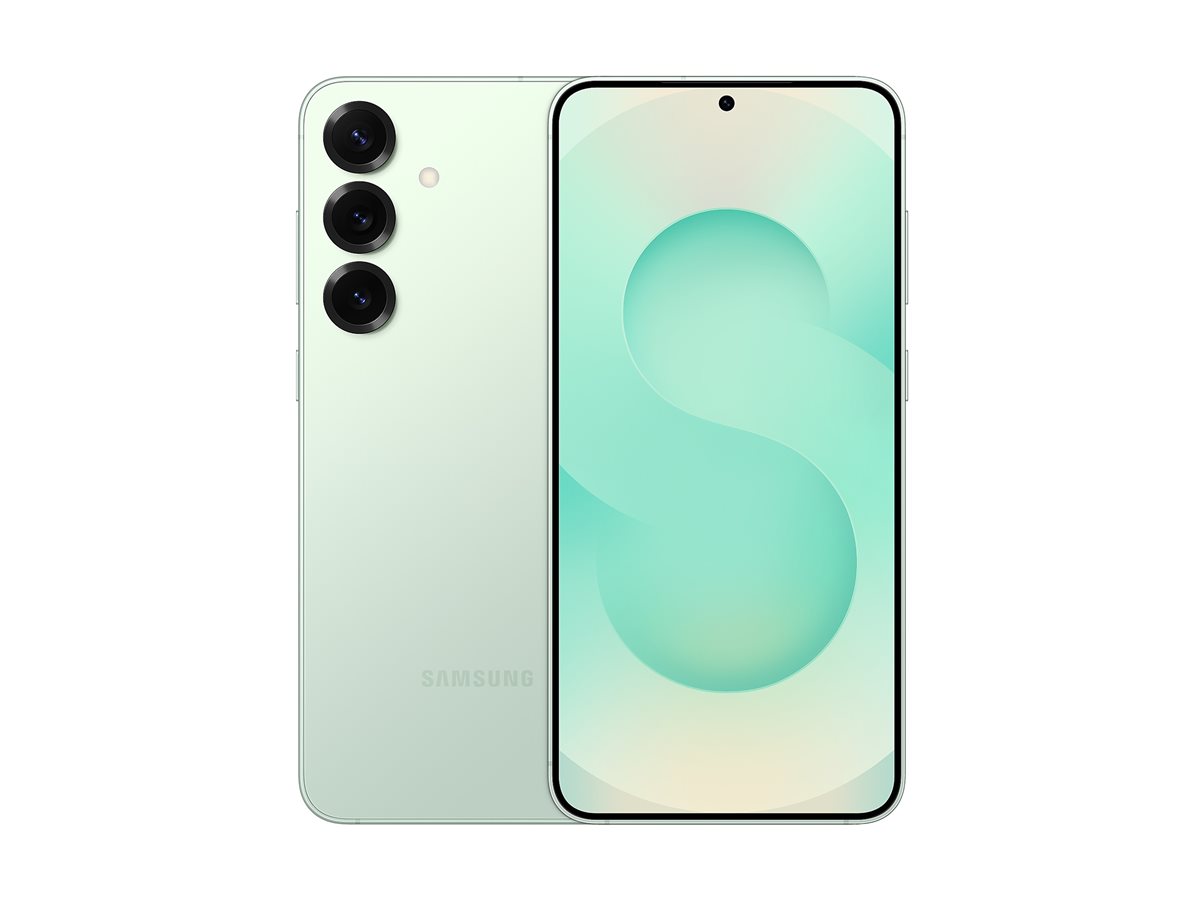 Smartphone Samsung verde claro com três câmaras traseiras e ecrã grande