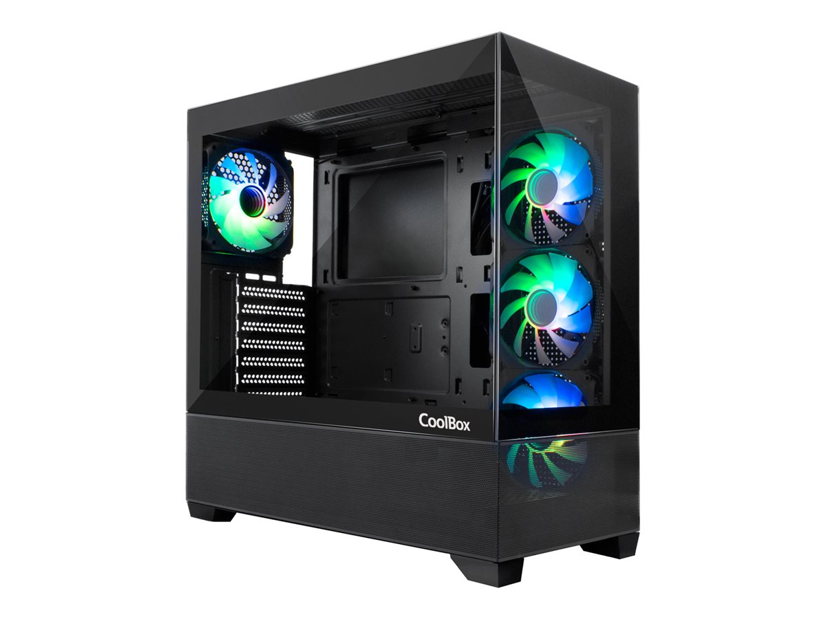 Torre de computador CoolBox preta com ventoinhas LED azuis e verdes e painel lateral em vidro temperado