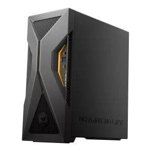 Computador torre preto com design angular e portas USB laterais
