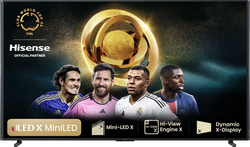 Televisor Hisense com imagem promocional do Mundial FIFA e jogadores de futebol