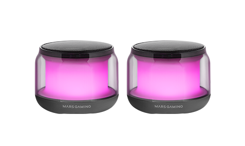 Duas colunas portáteis Mars Gaming pretas com luzes LED rosa