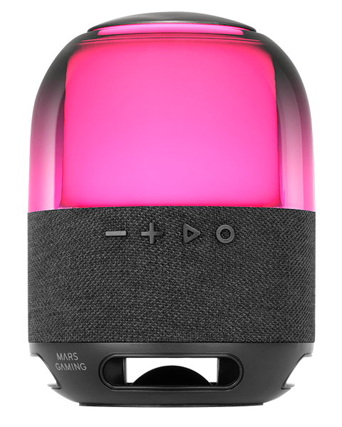 Coluna portátil Mars Gaming com luz LED rosa e corpo em tecido cinzento