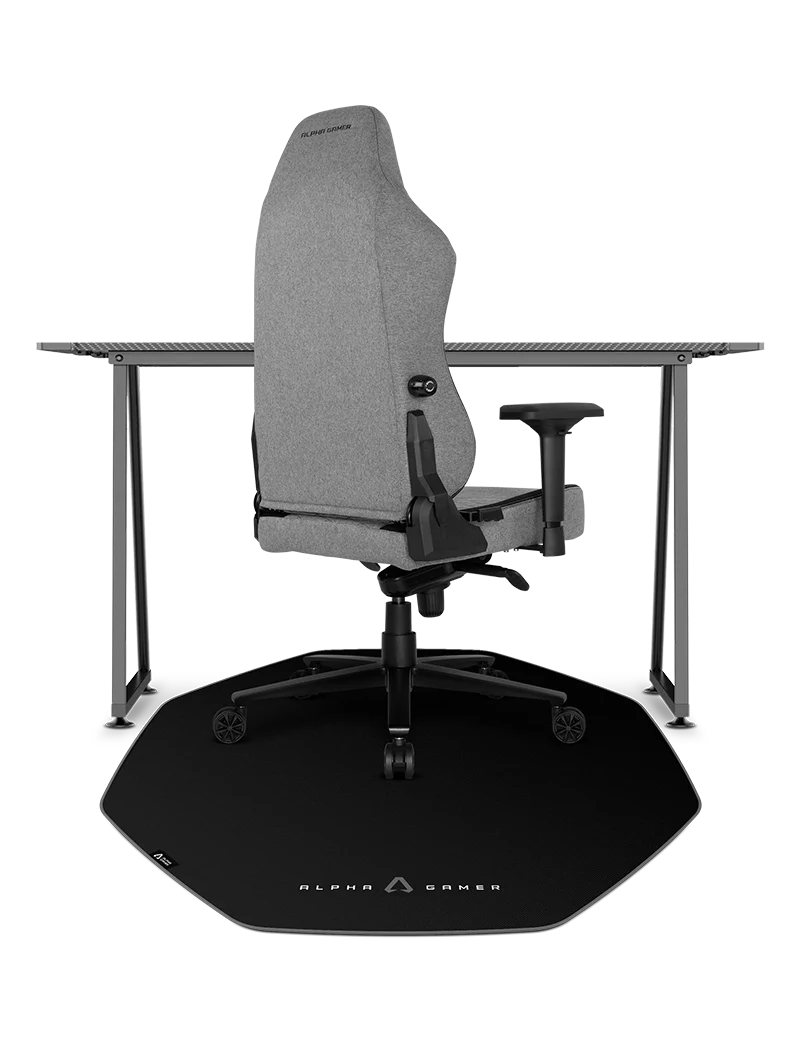 Cadeira de escritório cinza e tapete preto ALPHA GAMER em mesa preta