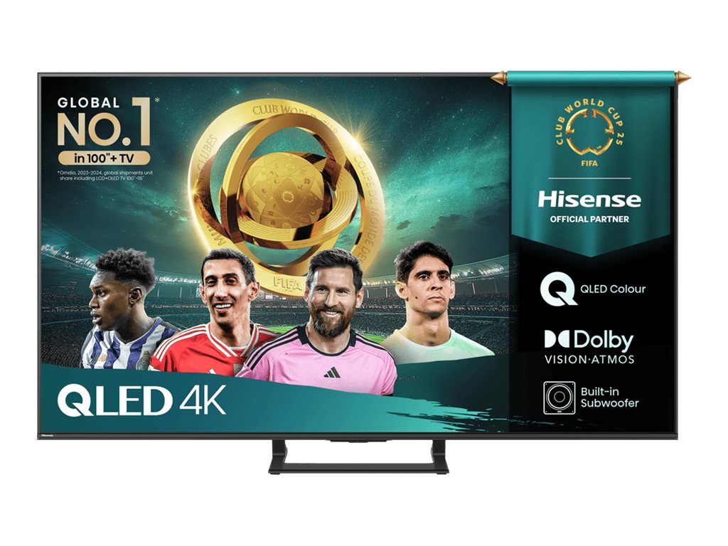 Monitor QLED 4K a mostrar quatro jogadores de futebol e um troféu dourado no ecrã