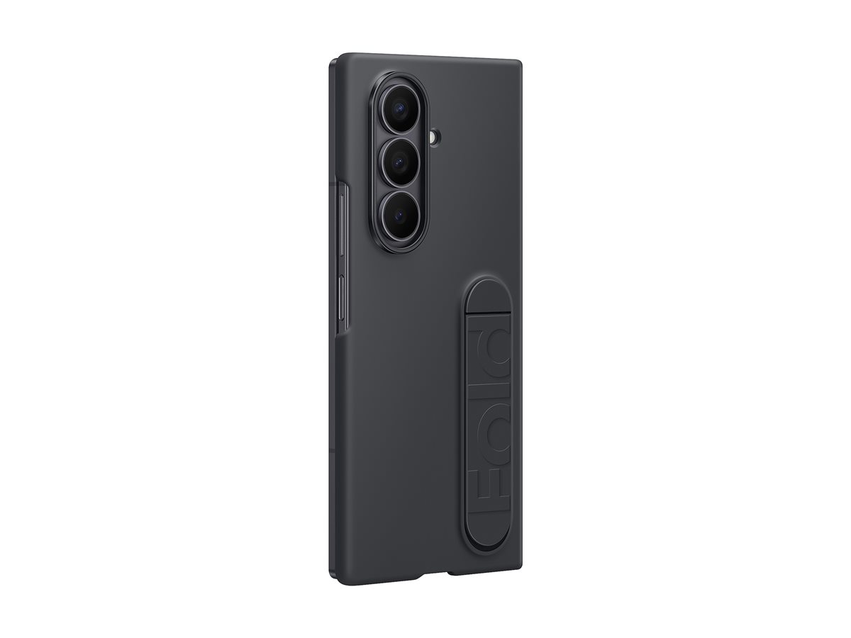 Capa de telemóvel preta com suporte integrado e três câmaras visíveis