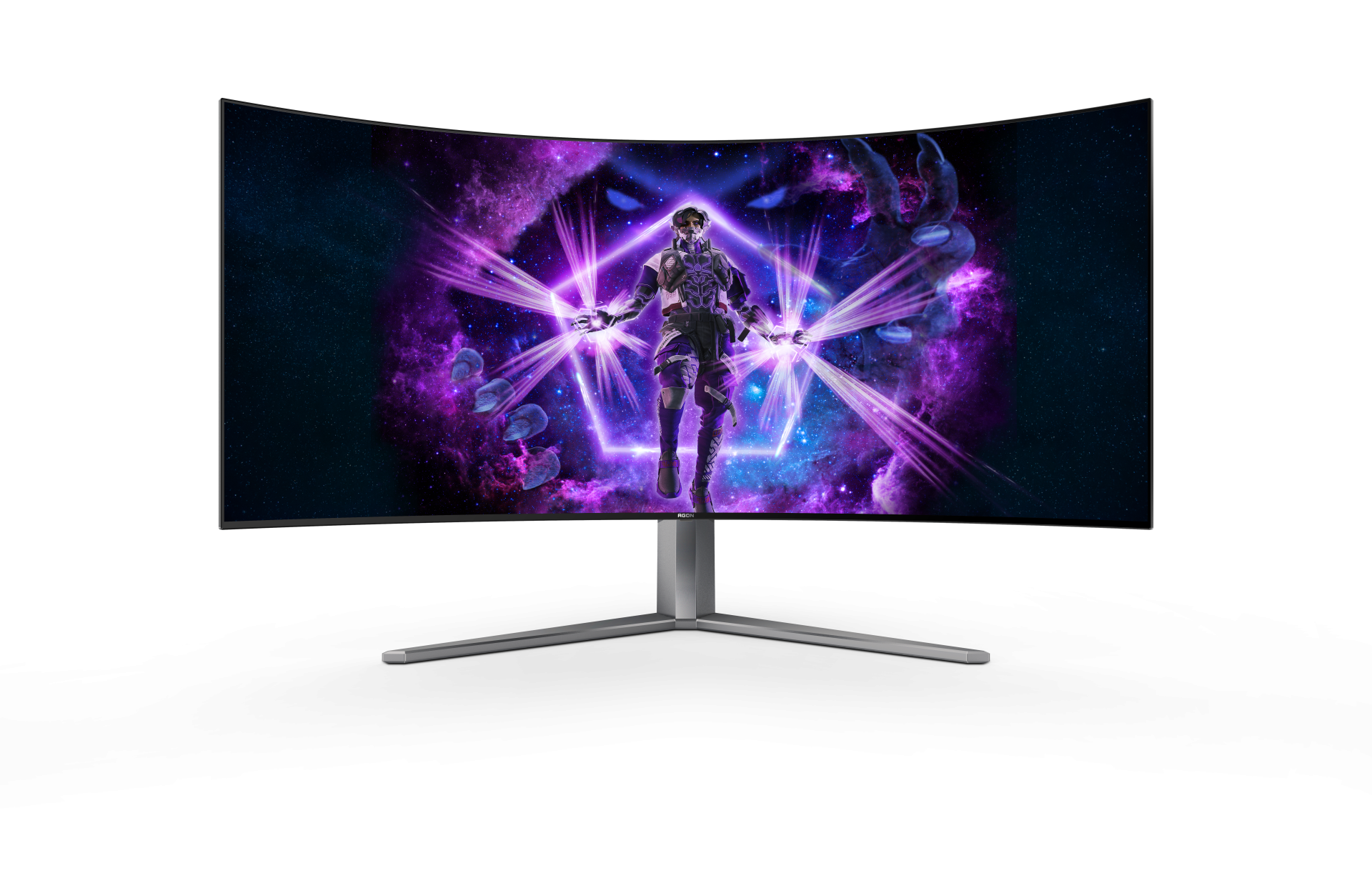 Monitor ultrapanorâmico curvo a exibir jogo digital com personagem futurista