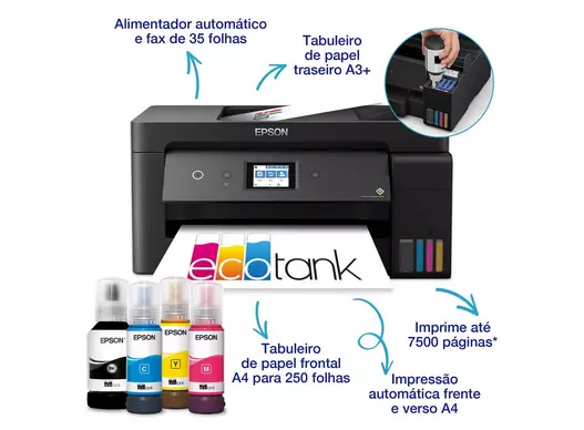 Impressora Epson EcoTank preta com tinteiros de tinta colorida e texto explicativo sobre funcionalidades