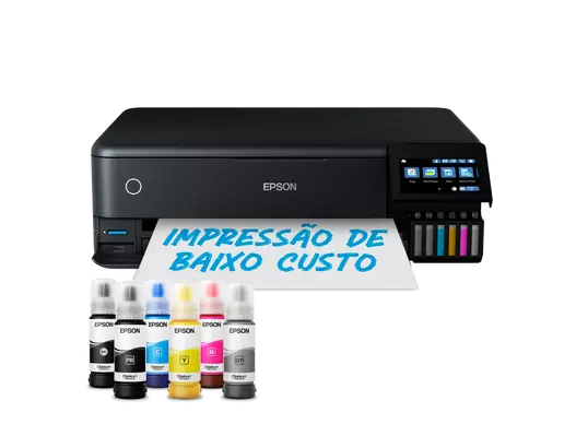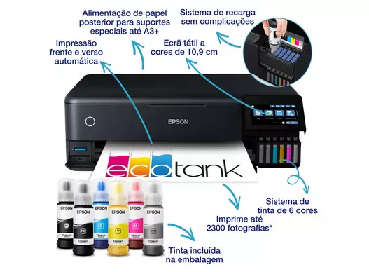 Impressora Epson Ecotank preta com frascos de tinta e texto em português