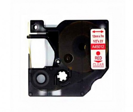 Cassete de fita para rotuladora preta com etiqueta de dimensões e cor em branco e vermelho.