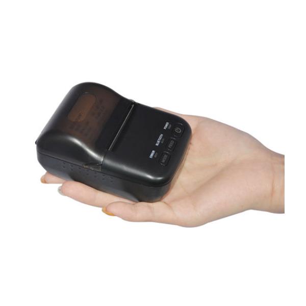Impressora portátil térmica preta numa mão sobre fundo branco