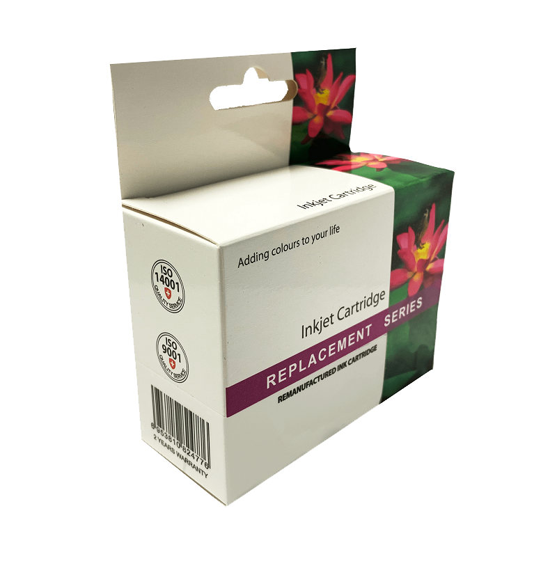 Caixa branca de cartucho de tinta com imagens de flores e texto de marca
