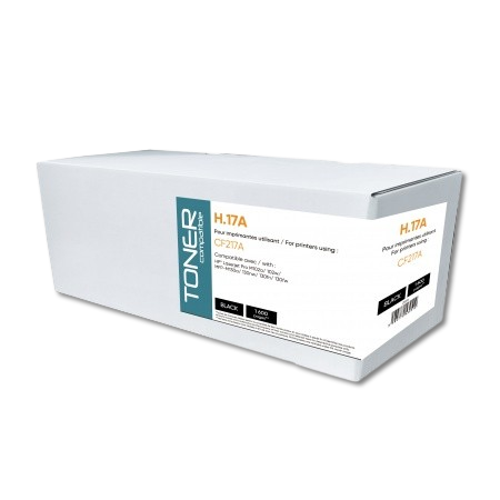 Embalagem branca de toner H.17A com etiqueta azul e branca e texto impresso
