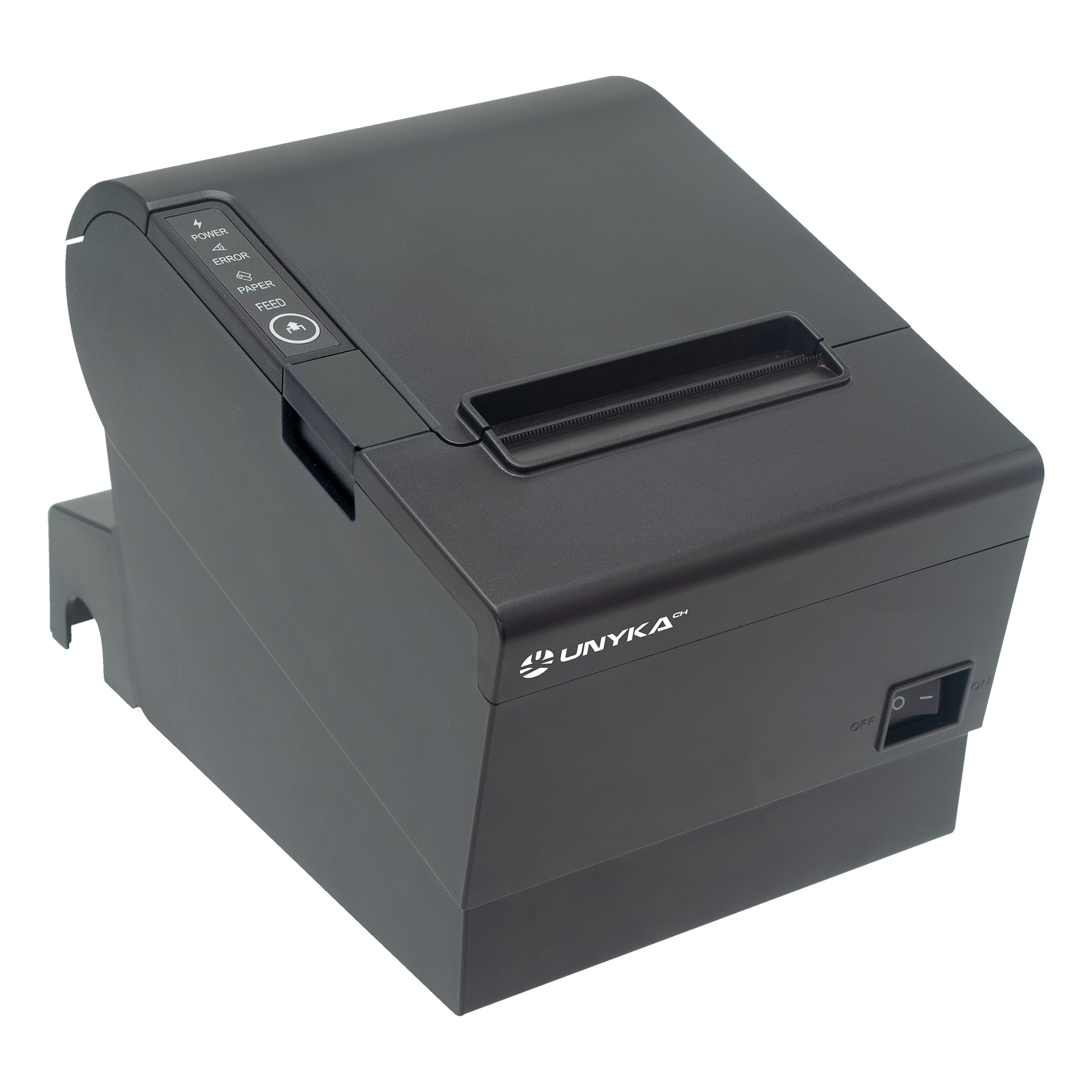 Impressora térmica de recibos preta UNYKA sobre fundo branco
