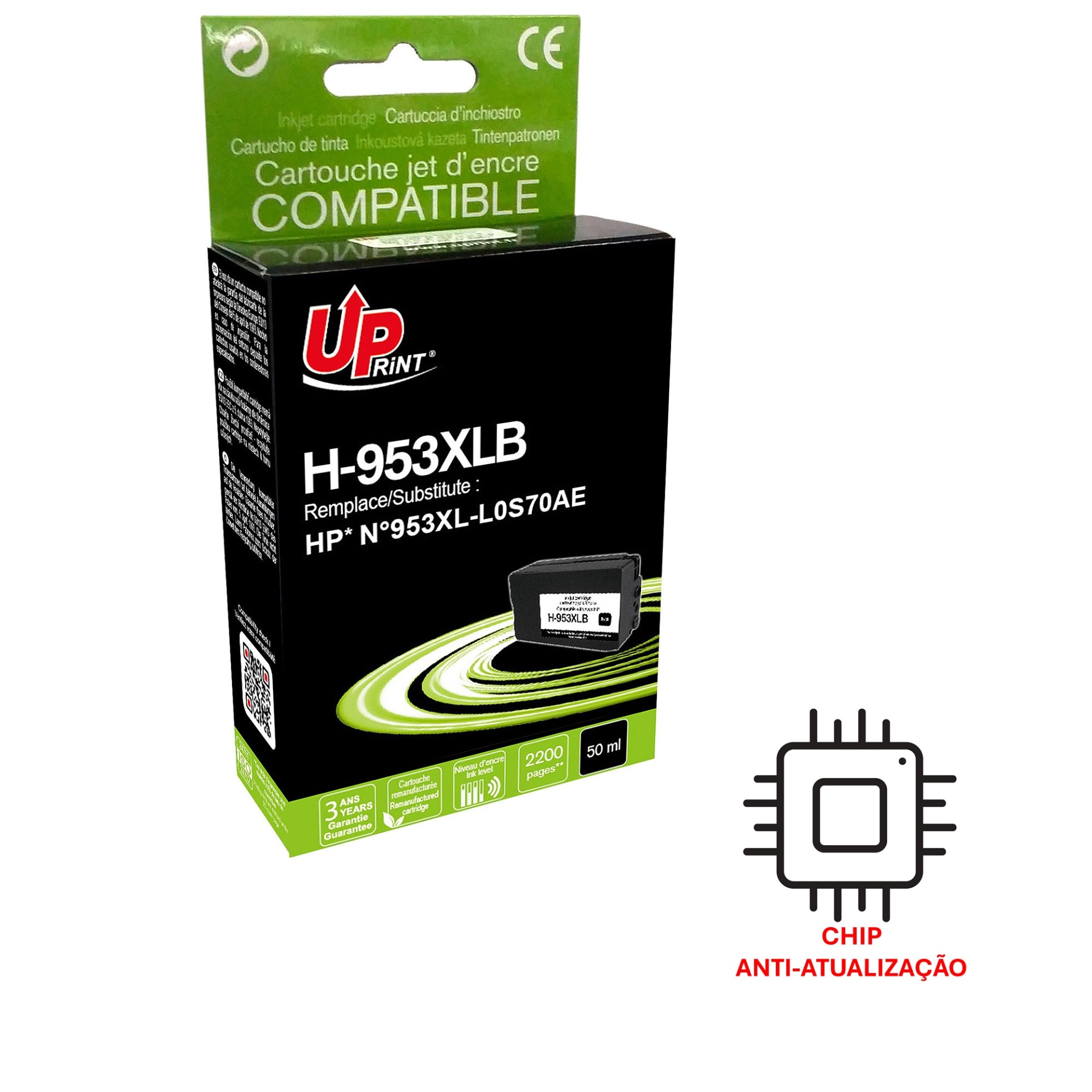 Caixa preta e verde de tinta para impressora UP print H-953XLB com texto e ícone de chip